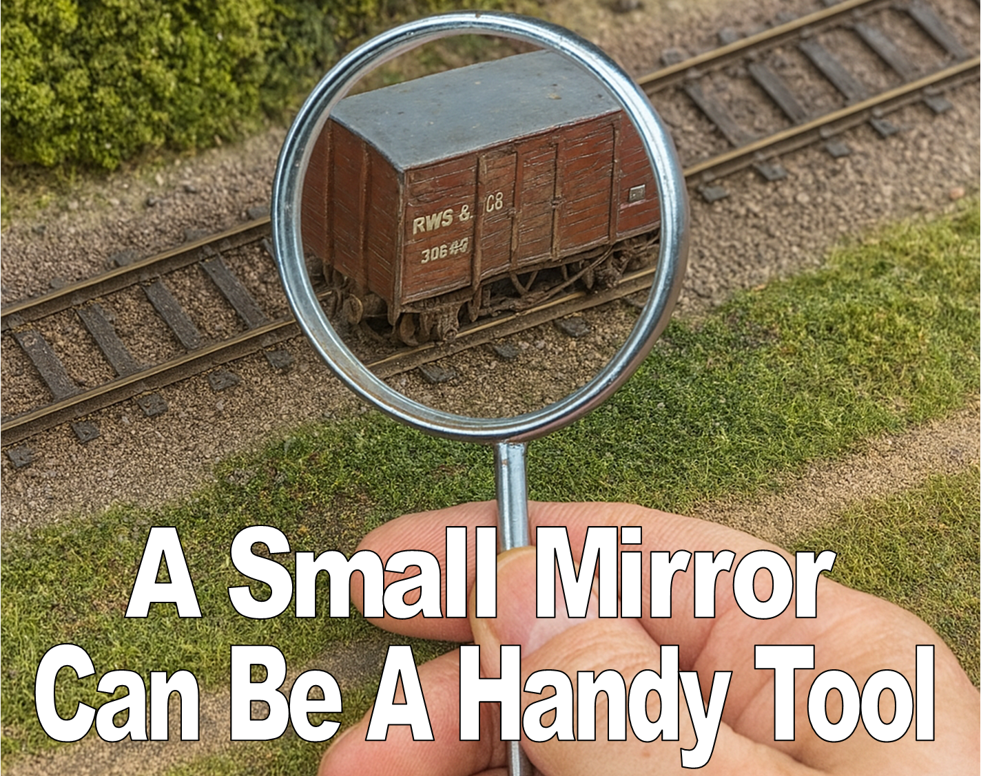 One of the best uses for a mirror is checking track alignment. By standing a small mirror on its edge directly on the track, you can examine the rails by looking at their reflection rather than trying to sight along them at track level. This reflected view exaggerates imperfections, making subtle kinks, dips, and uneven joints far easier-to-detect. Issues that look smooth when viewed normally often stand out clearly when seen in a mirror.