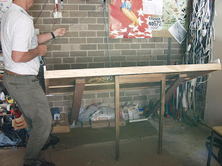 A rope and 2 pulleys is then used to lift the back edge up until it is horizontal and 2 sliding bolts lock it into the metal angles each side. One man can do this quite easily despite the considerable weight (the board is approx 1.1 x 1.7 M and has a 110 x 19 timber on 3 sides to stiffen it.