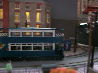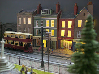 Working street lights, bulbs powered by an old DC controller, are fitted and lighting in the buildings is proved a battery powered leds (a string of 20 mini Christmas lights – excellent value for money!) There is also an old ‘tardis’ type blue Police Box which is surmounted by a switchable flashing blue light.