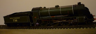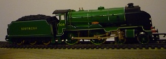 My model shown above shows the large diameter driving wheels, the smoke deflectors with their frontal curvature thereby giving the locomotive a very imposing appearance, and the large bogie tender. There was a reason for the large tender because the Southern Railway as distinct from the other three British main line railways, had no water troughs. On the Central and Eastern sections where the journey distances were fifty to seventy miles only, this did not matter and smaller tenders could be used. However the western section which ran right down to Padstow in Cornwall and right past Camelford which is believed to be the site of King Arthur’s Camelot, was more than 200 miles. It was necessary therefore to have adequate supplies of coal and water on the locomotive.