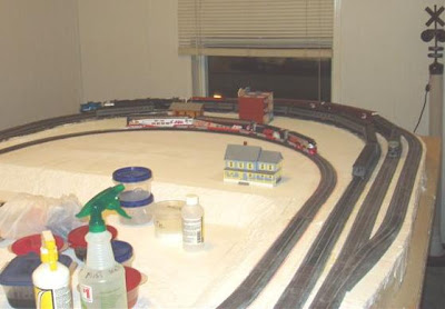 Tracks are layed down over foam roadbed. I have 3 trains sets. I am currently making rocks and boulders in molds with lightweight hydrocal and glueing them into the mountainous areas. Soon will start painting and putting in the color.