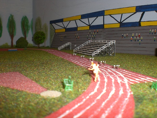The layout is a module built according to the NedTrak-standards (comparable to N track). It measures 120 by 60 cm and depicts a sportsground in the Netherlands.